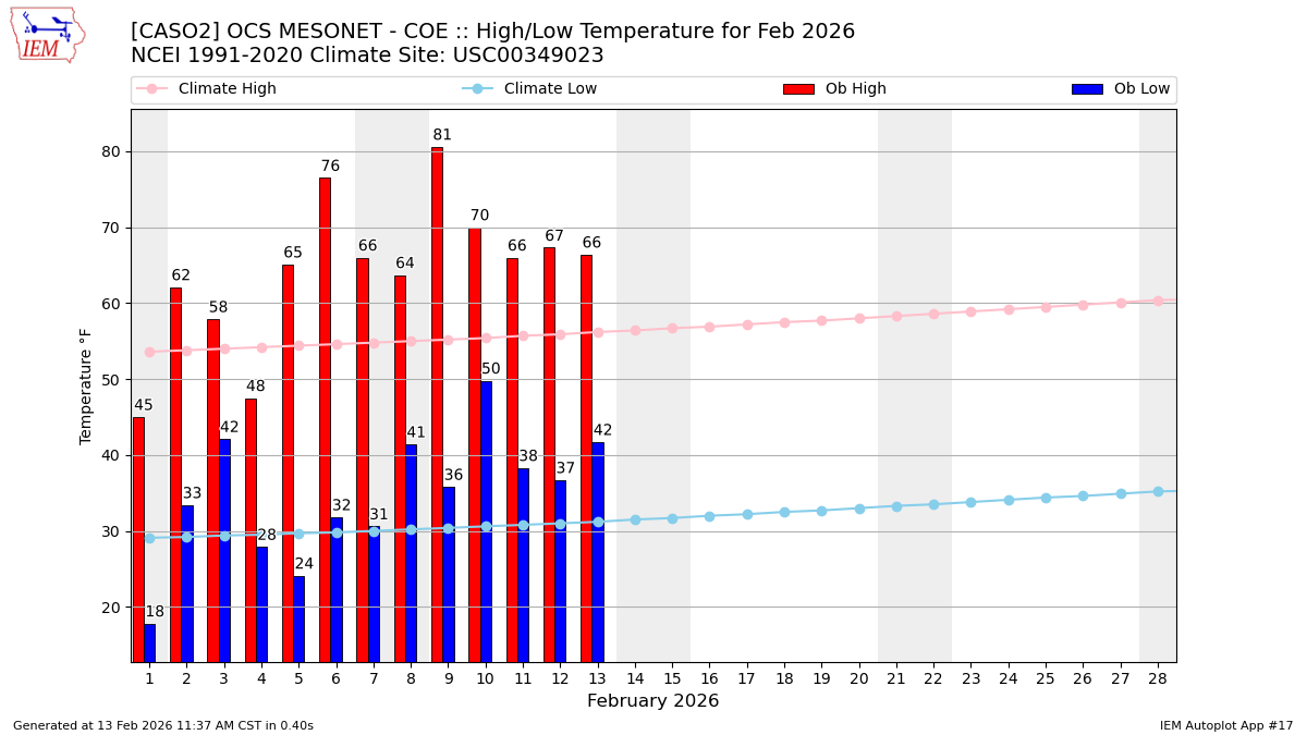 Description: This chart of the monthly temperature data. The bars are the observations and the dots are climatology.