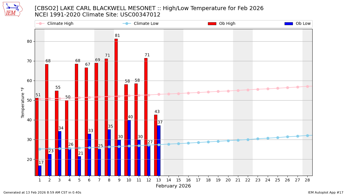 Description: This chart of the monthly temperature data. The bars are the observations and the dots are climatology.