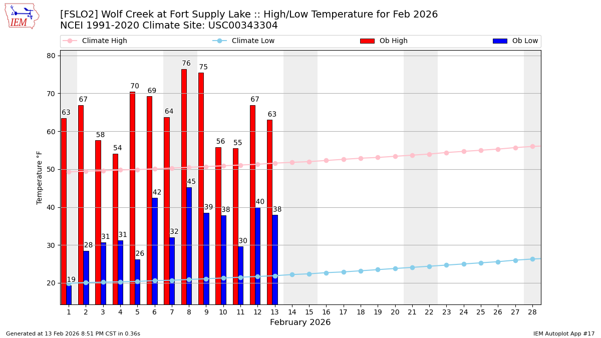 | 08 High: 76.44 Low: 45.25 Precip: M Max Stage[ft]: 2004.80 RH% Min/Max: 16-74 Feel Min/Max: 44 to 76 | 09 High: 75.47 Low: 38.53 Precip: M Max Stage[ft]: 2004.78 RH% Min/Max: 15-78 Feel Min/Max: 37 to 75 | 10 High: 55.85 Low: 37.85 Precip: M Max Stage[ft]: 2004.76 RH% Min/Max: 33-71 Feel Min/Max: 35 to 56 | 11 High: 55.49 Low: 29.61 Precip: M Max Stage[ft]: 2004.71 RH% Min/Max: 32-80 Feel Min/Max: 26 to 55 | 12 High: 66.94 Low: 39.94 Precip: M Max Stage[ft]: 2004.67 RH% Min/Max: 29-68 Feel Min/Max: 37 to 67 | 13 High: 63 Low: 37.92 Precip: M Max Stage[ft]: 2004.64 RH% Min/Max: 57-92 Feel Min/Max: 35 to 63 | 14 Precip: M |