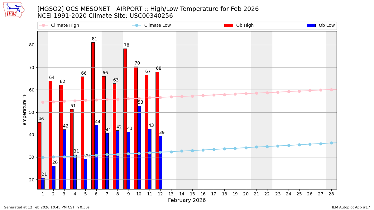 Description: This chart of the monthly temperature data. The bars are the observations and the dots are climatology.