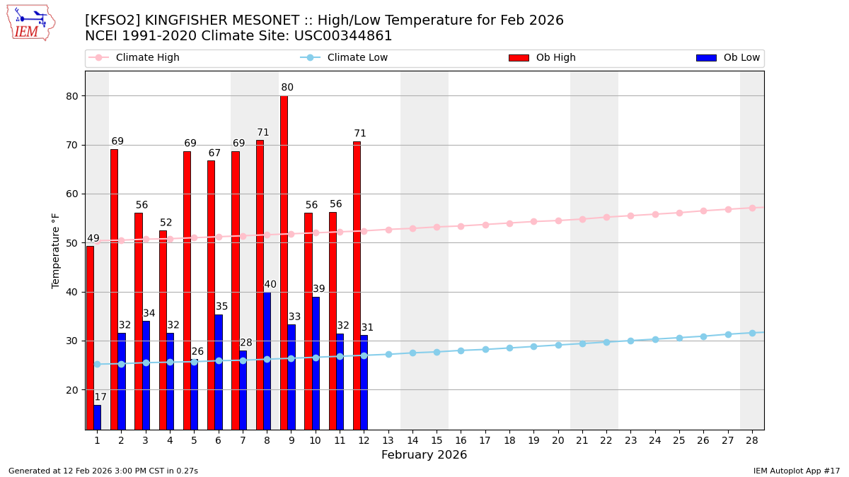 Description: This chart of the monthly temperature data. The bars are the observations and the dots are climatology.