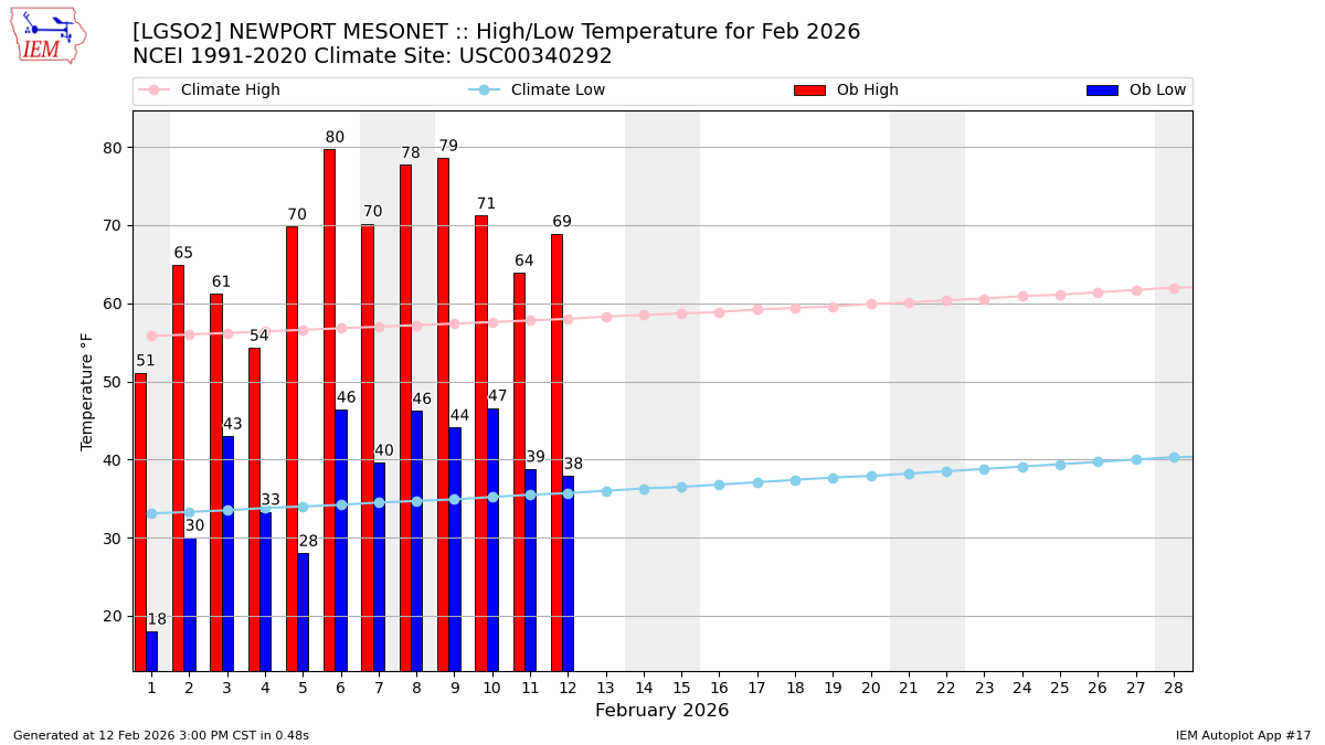 Description: This chart of the monthly temperature data. The bars are the observations and the dots are climatology.