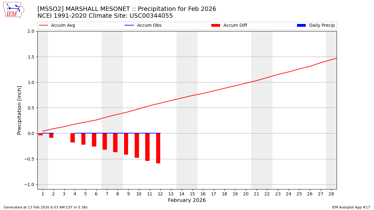 Description: This chart is of daily precipitation for the month. The red line would be an average month while the blue line and bars are observations.