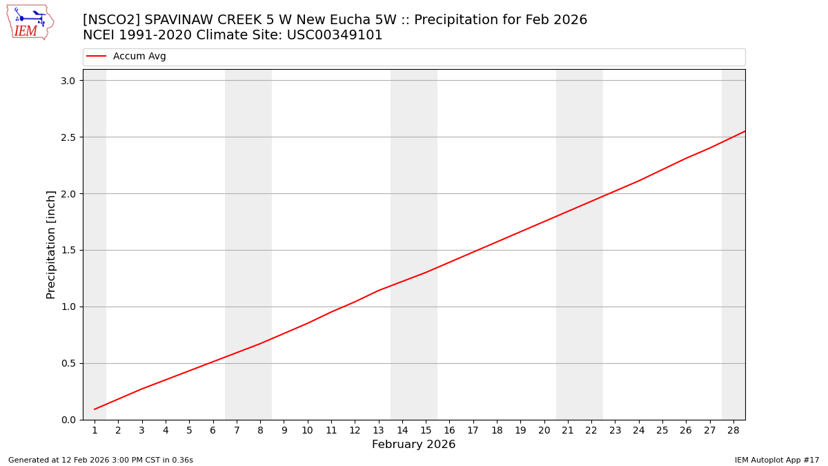 Description: This chart is of daily precipitation for the month. The red line would be an average month while the blue line and bars are observations.