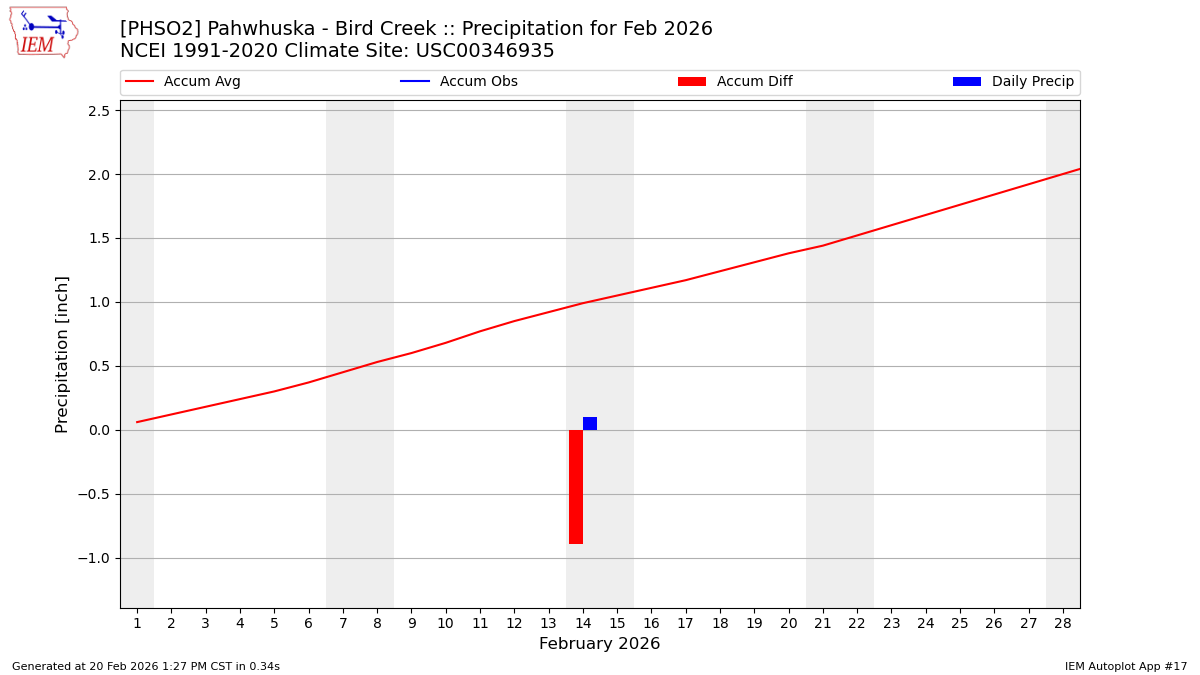 Description: This chart is of daily precipitation for the month. The red line would be an average month while the blue line and bars are observations.