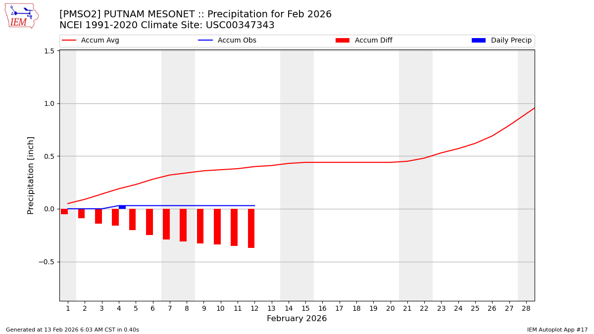 Description: This chart is of daily precipitation for the month. The red line would be an average month while the blue line and bars are observations.