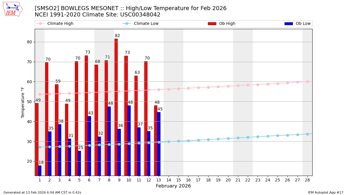 Description: This chart of the monthly temperature data. The bars are the observations and the dots are climatology.
