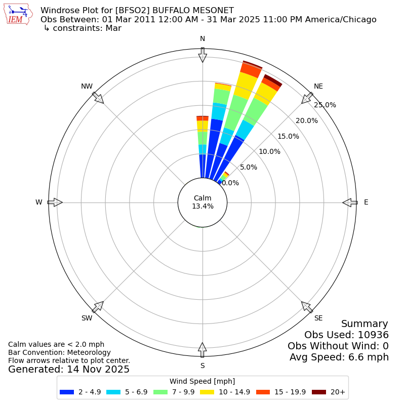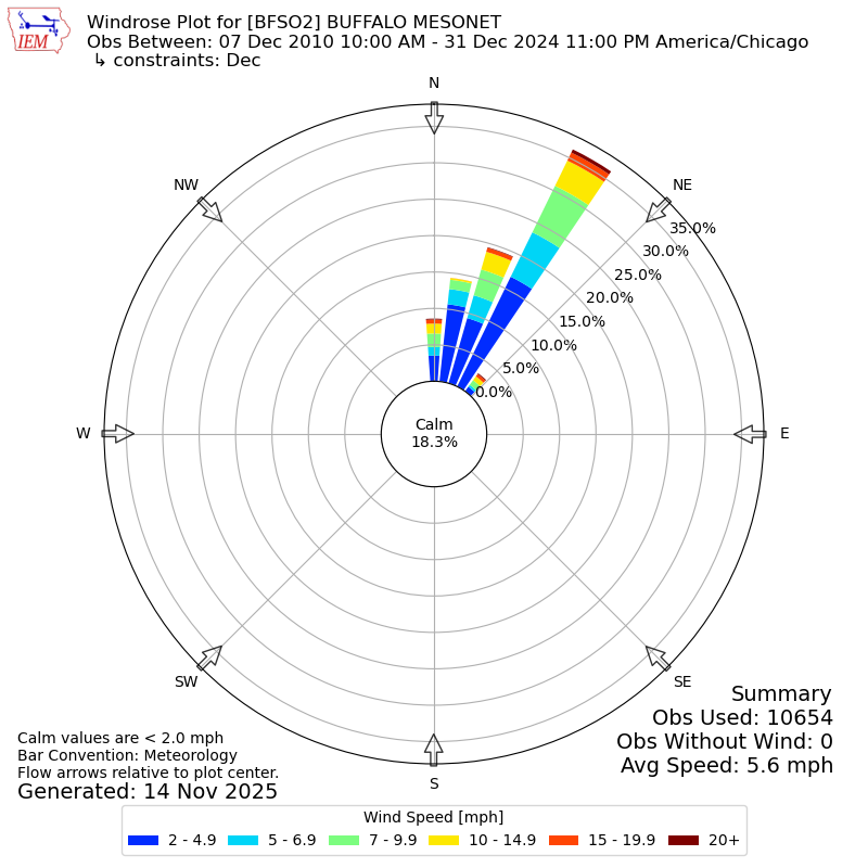 The IEM has generated these wind roses based on our archive. The archive does contain errors and non-representative data, so please use care when using these plots. In general, data from airports is of good quality and representative of the local surrounding area.