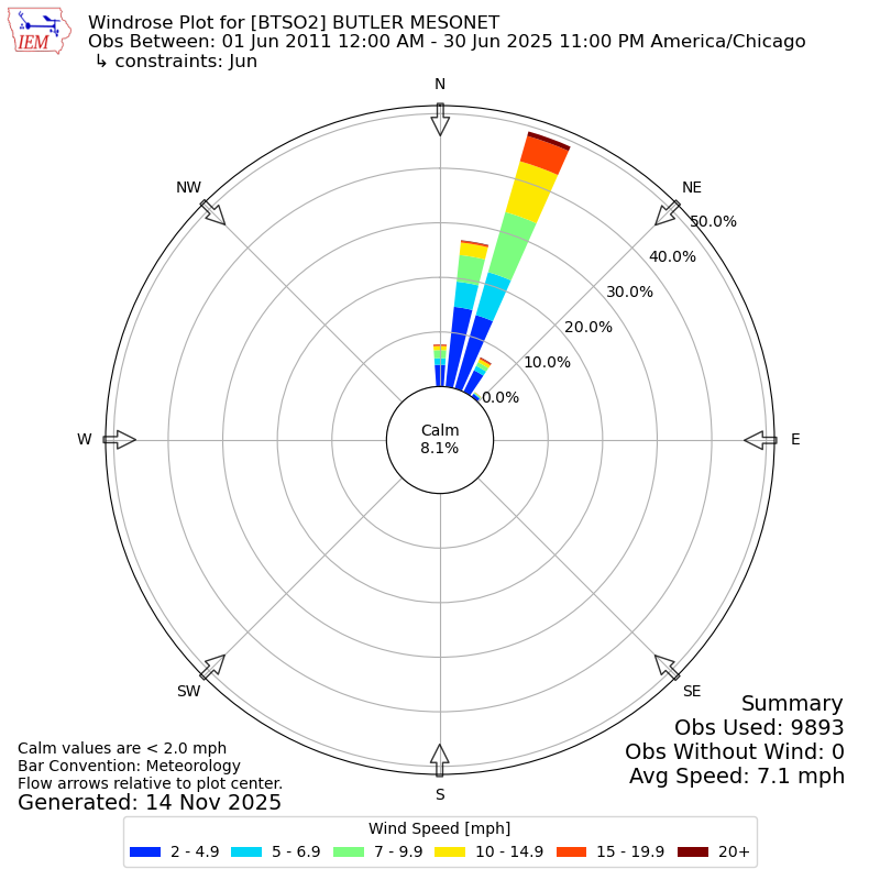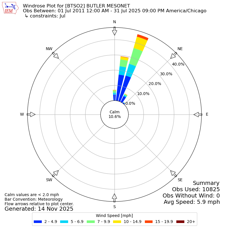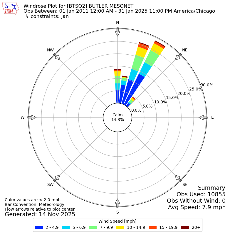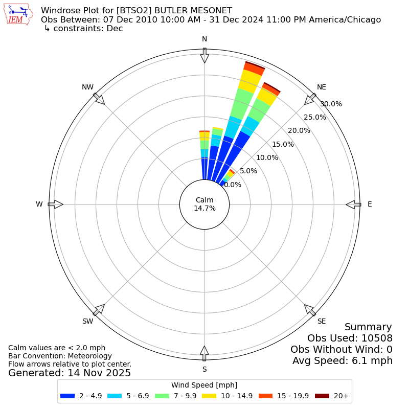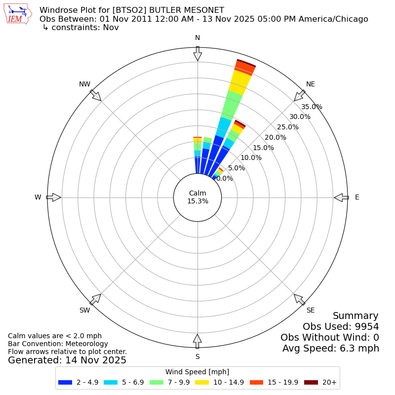 The IEM has generated these wind roses based on our archive. The archive does contain errors and non-representative data, so please use care when using these plots. In general, data from airports is of good quality and representative of the local surrounding area.