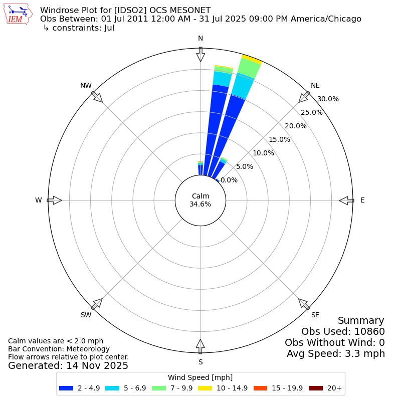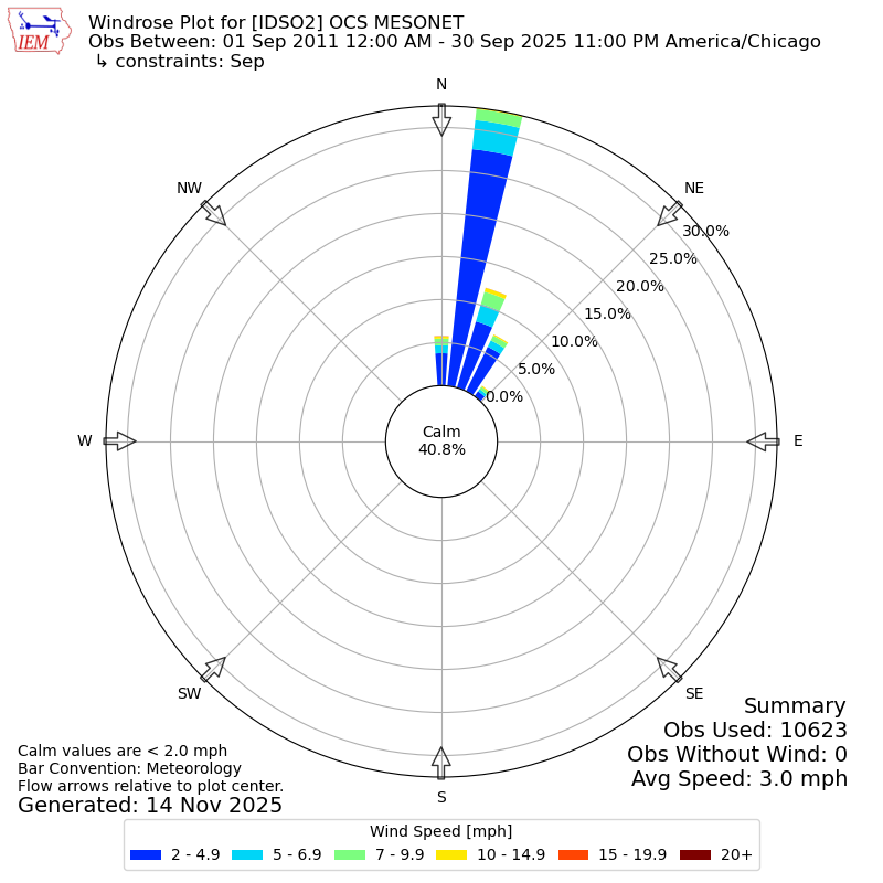 The IEM has generated these wind roses based on our archive. The archive does contain errors and non-representative data, so please use care when using these plots. In general, data from airports is of good quality and representative of the local surrounding area.