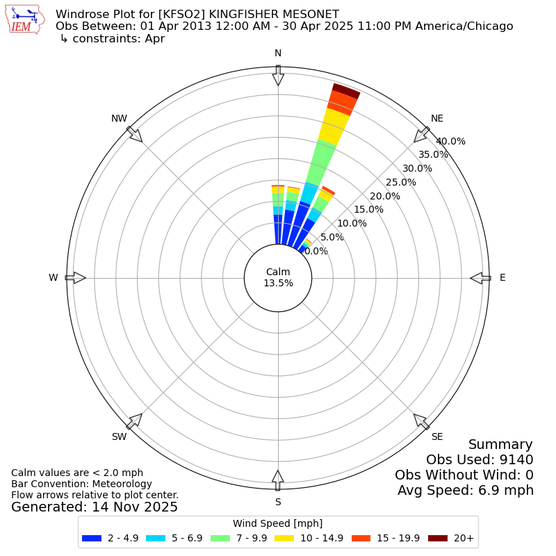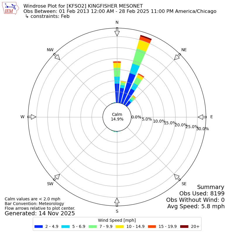 The IEM has generated these wind roses based on our archive. The archive does contain errors and non-representative data, so please use care when using these plots. In general, data from airports is of good quality and representative of the local surrounding area.