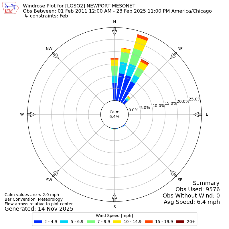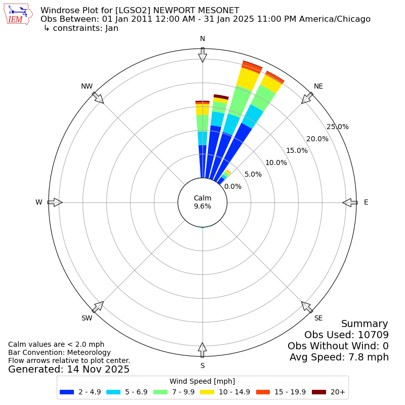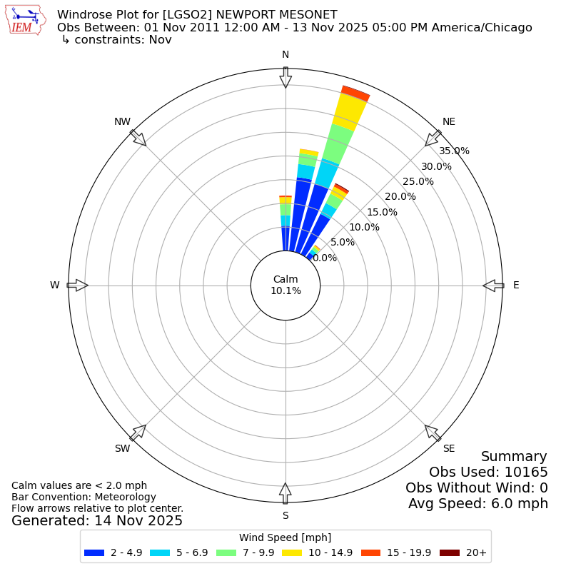 The IEM has generated these wind roses based on our archive. The archive does contain errors and non-representative data, so please use care when using these plots. In general, data from airports is of good quality and representative of the local surrounding area.