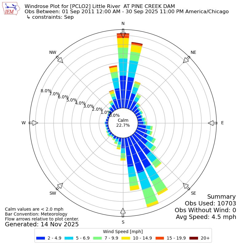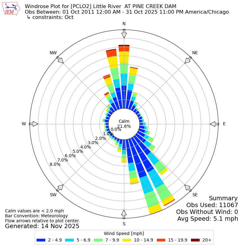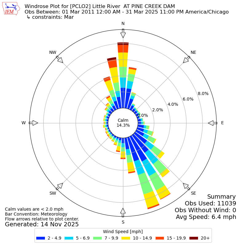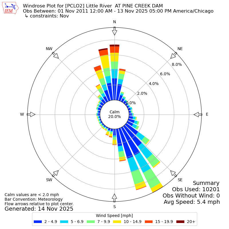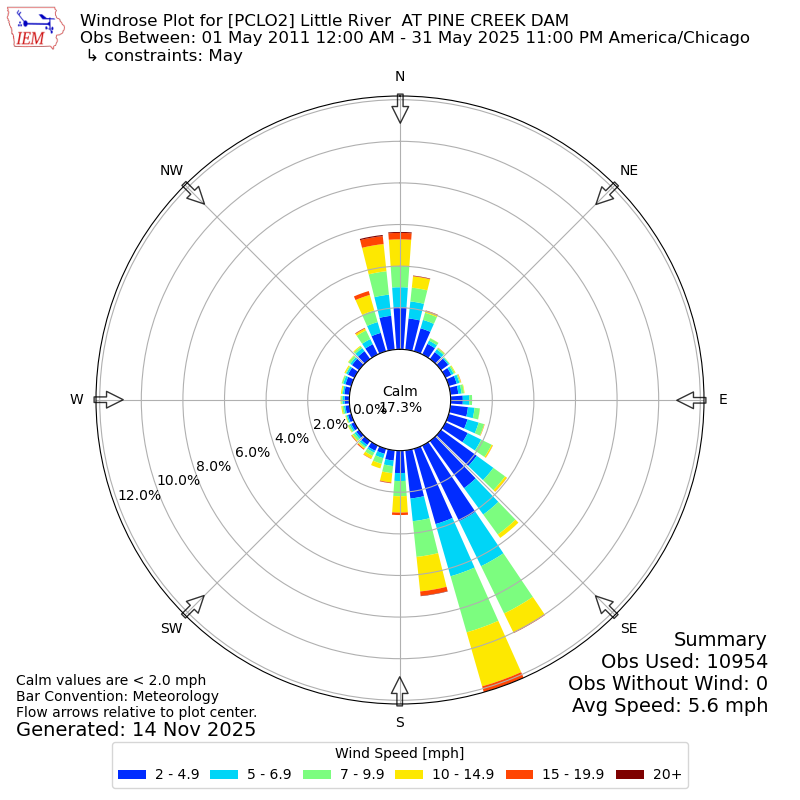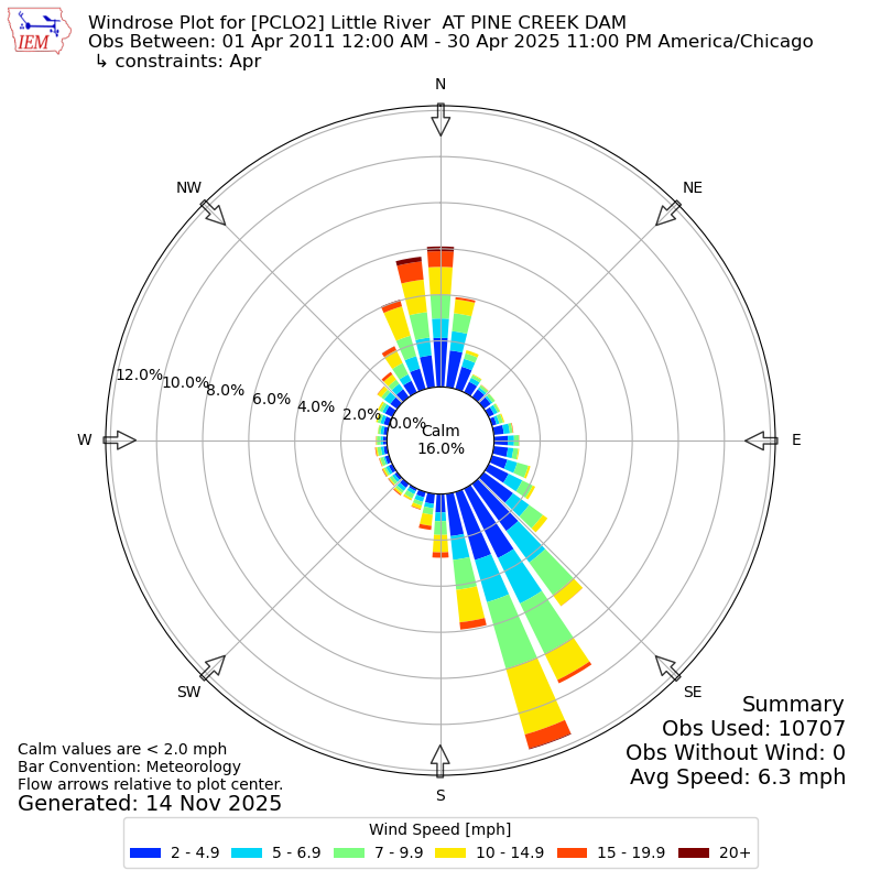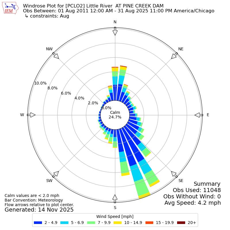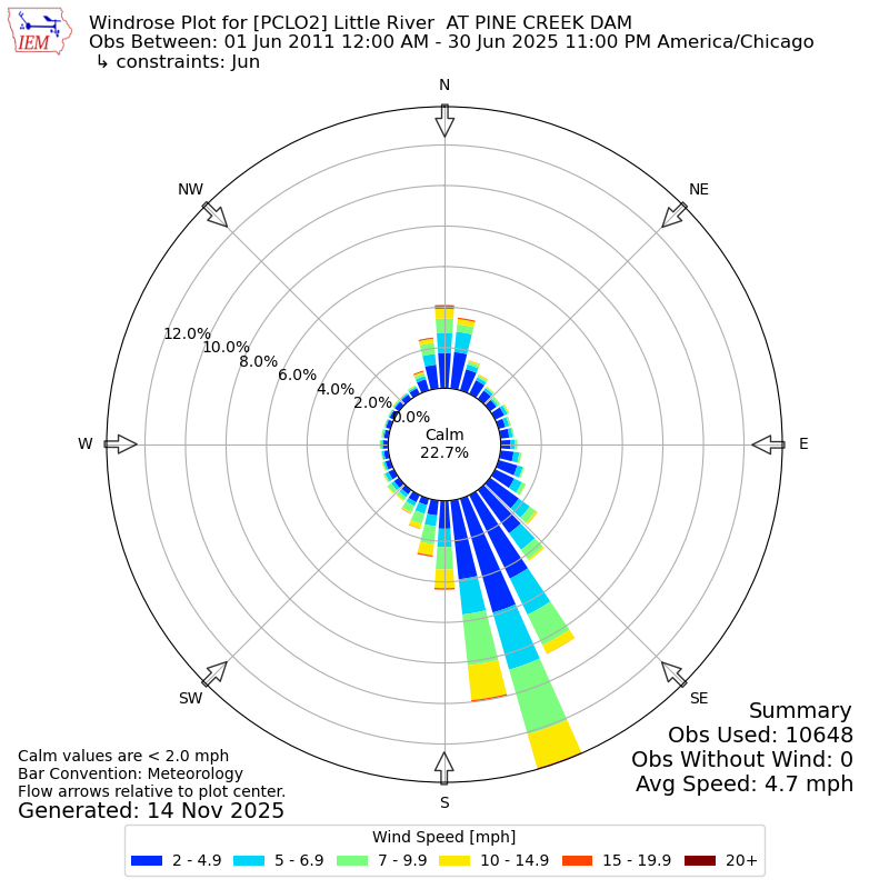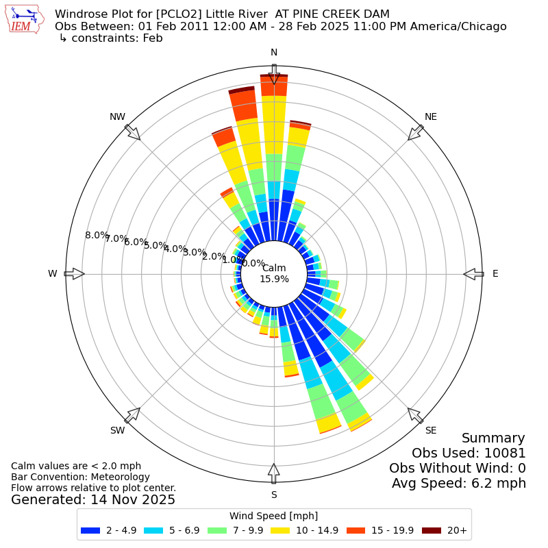 The IEM has generated these wind roses based on our archive. The archive does contain errors and non-representative data, so please use care when using these plots. In general, data from airports is of good quality and representative of the local surrounding area.