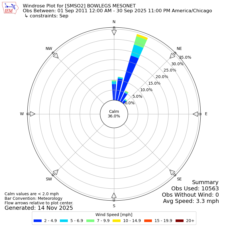 The IEM has generated these wind roses based on our archive. The archive does contain errors and non-representative data, so please use care when using these plots. In general, data from airports is of good quality and representative of the local surrounding area.
