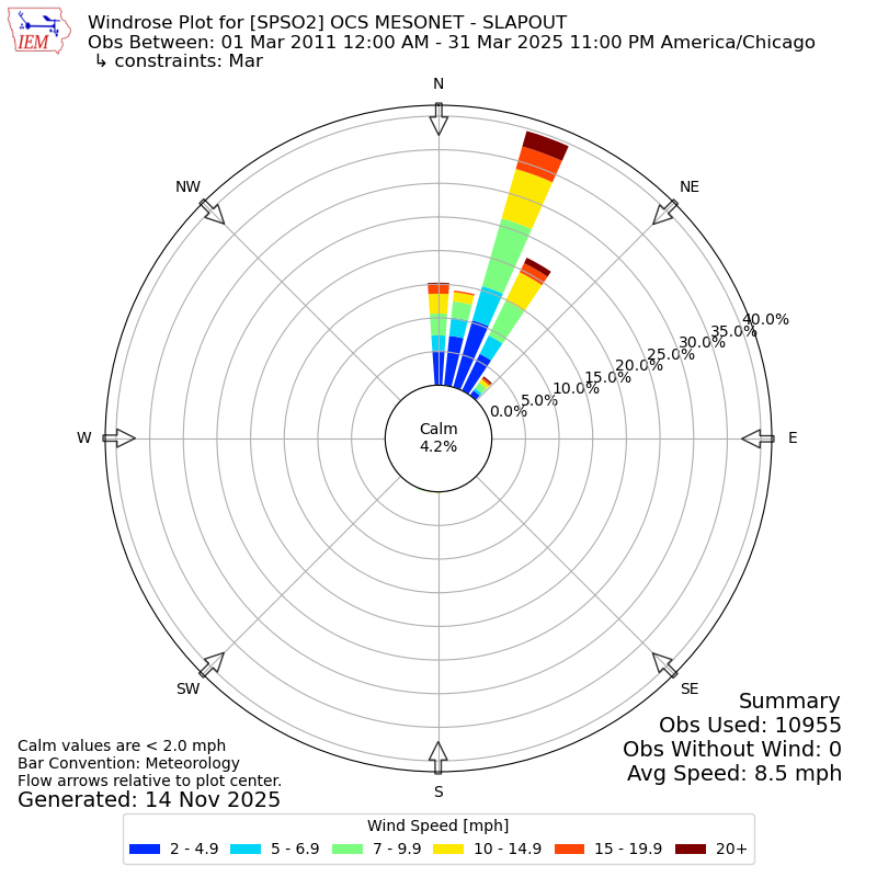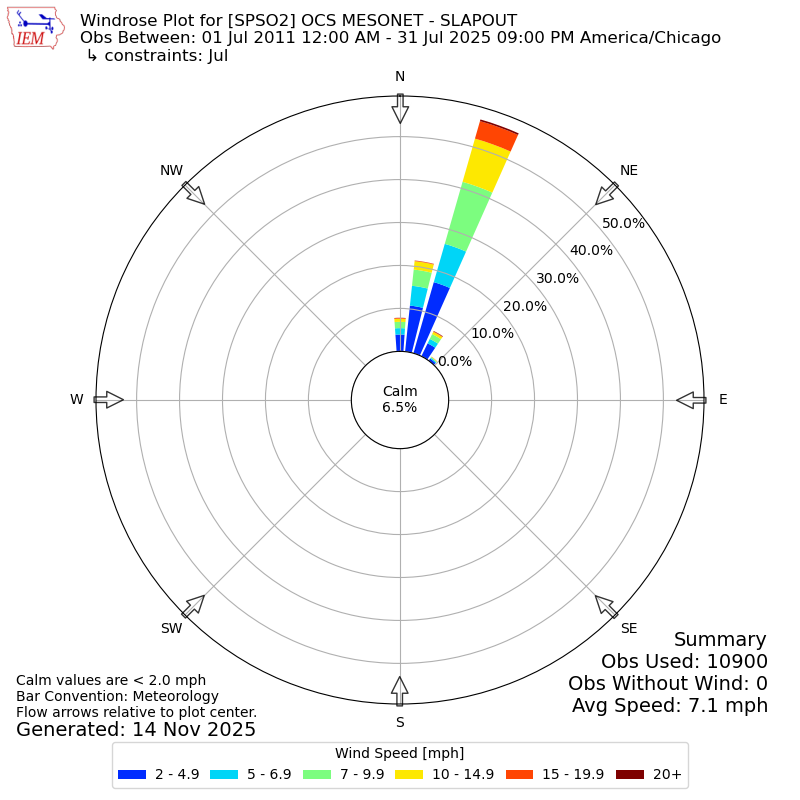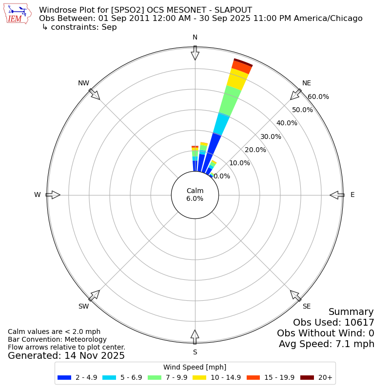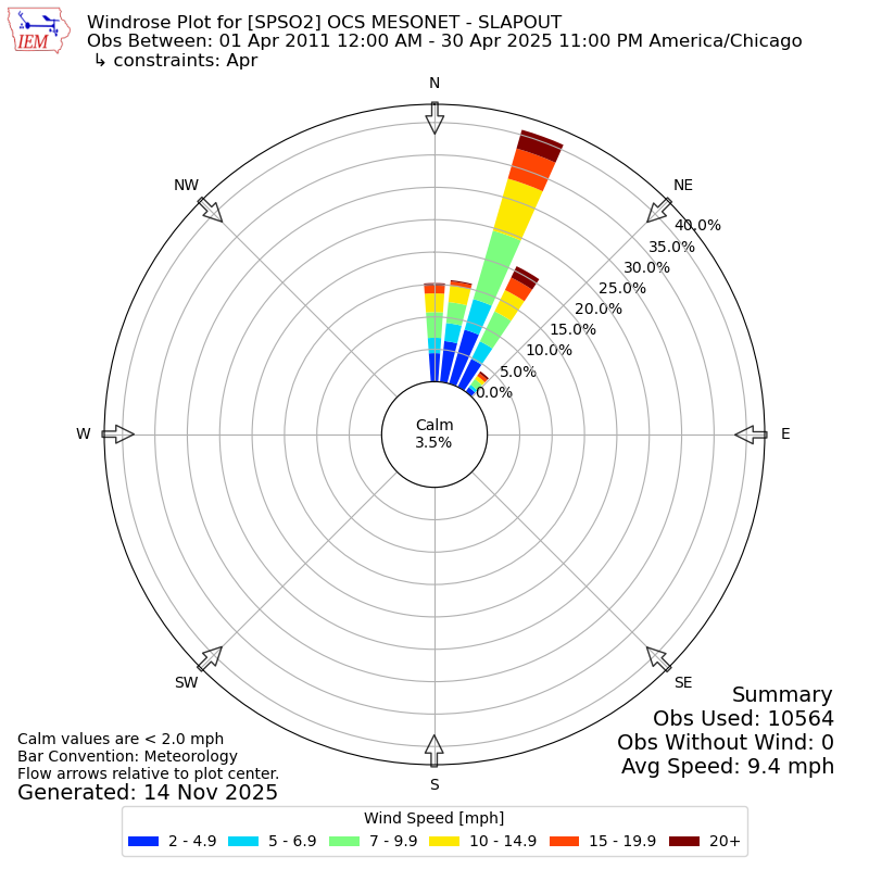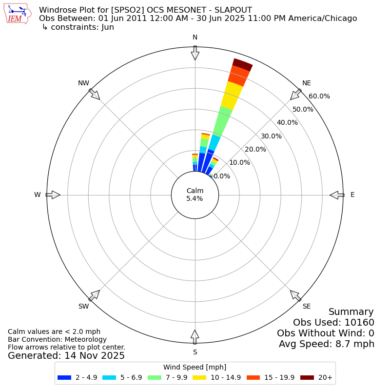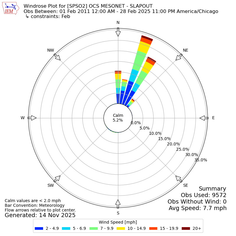 The IEM has generated these wind roses based on our archive. The archive does contain errors and non-representative data, so please use care when using these plots. In general, data from airports is of good quality and representative of the local surrounding area.