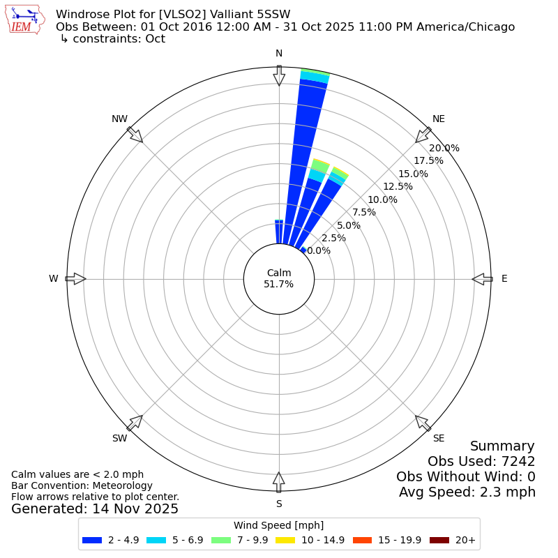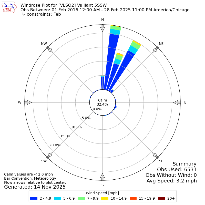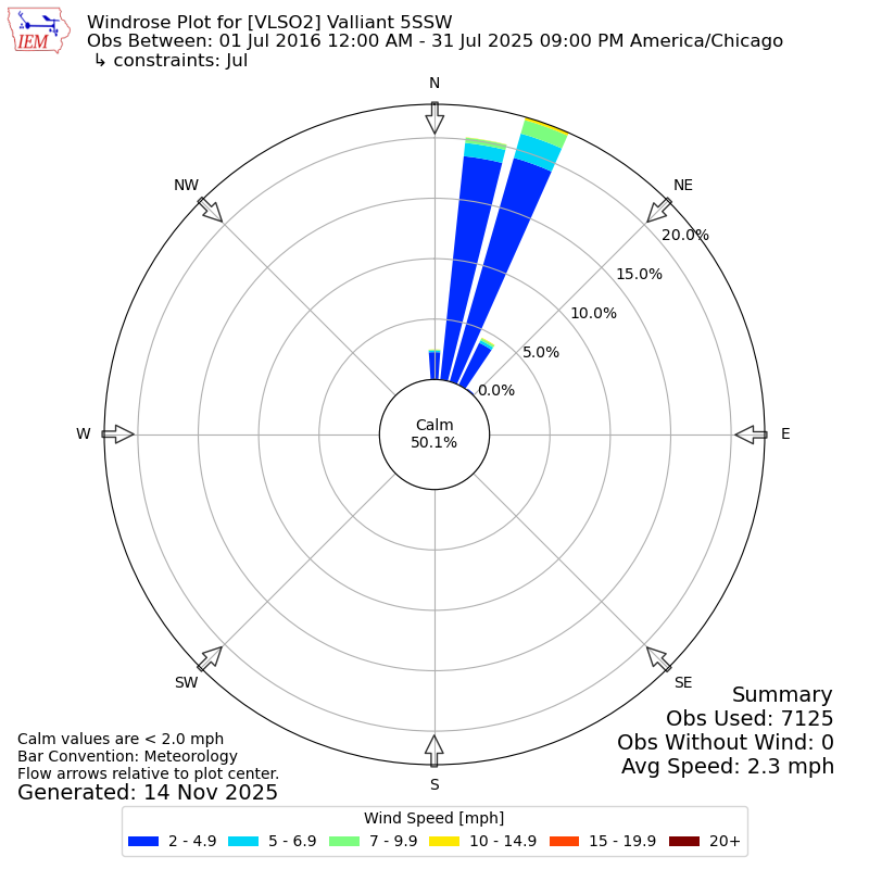 The IEM has generated these wind roses based on our archive. The archive does contain errors and non-representative data, so please use care when using these plots. In general, data from airports is of good quality and representative of the local surrounding area.
